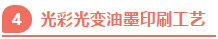 有色荧光工艺。在纪念钞的正面,正常光下观察正面竖号码为红色,长城衬景图案为粉红色,对印图案为暗红色,在特定波长的紫光灯下观察,竖号码和长城衬景图案均为橘黄色。