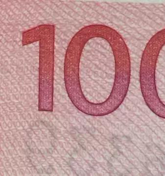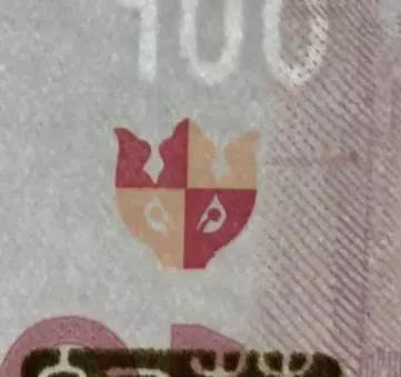 胶印缩微面额数字。纪念钞背面左上角粉红色底纹处,用放大镜观察可见胶印的“100”字样的面额数字。