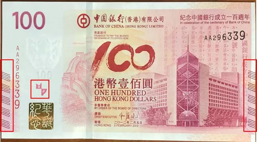 中国银行百年华诞纪念钞保留了流通版港币100元券的主要防伪特征,并采用了新颖的动态图像开窗安全线(MOTION安全线),轻转钞票可见中国银行行徽图案移动。