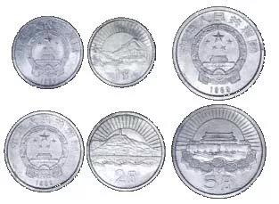 第五套1975年版面值1分、2分、5分,全套三枚,铝质,齿边,直径分别是17、21、24毫米。正面中央图案均为天安门、图案上方是仿宋体“中华人民共和国”国名,下方是面值和麦穗齿轮图。背面图案:壹分币是少年儿童手拿水壶为小树苗浇水图,贰分币是身背步枪英姿飒爽的女民兵手握镰刀割稻图,伍分币是炼钢工人手持钢钎炼钢图,图案的右下方是阿拉伯数字的金额,左上方是用拼音字母书写的面值。此套铝辅币设计主题明确,具有鲜明的时代气息,铸工极为精美,充分反映岀文革后期我国的铸币技术水平,在2010年北京诚轩拍卖会上被一买家以145.6万的高价拍走。