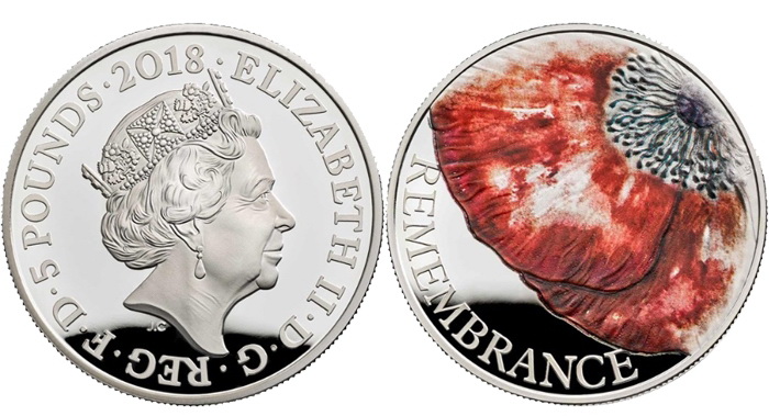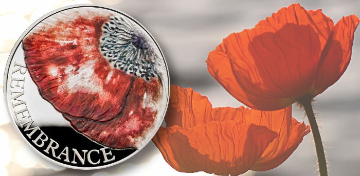 币面主景为罂粟花的局部特写。1915年12月,诗歌《在佛兰德斯战场》发表在英国伦敦的双周刊Punch上。因为这首诗,佛兰德斯战场盛开的红罂粟成为全球国殇纪念日佩花。在每年11月11日前后,人们都会在胸前佩带一朵红罂粟花来缅怀战争期间逝去的生命,也以此告诫子孙后代今天的和平生活来之不易。币左下方为英文“REMEMBERANCE”(追思)字样。