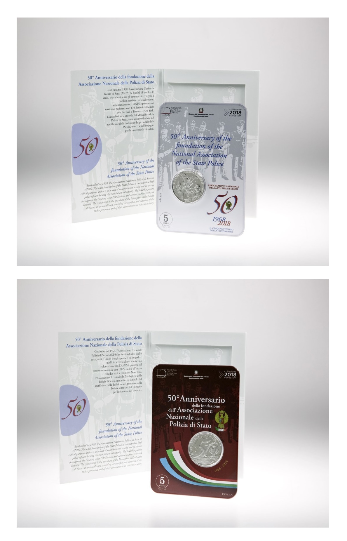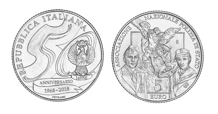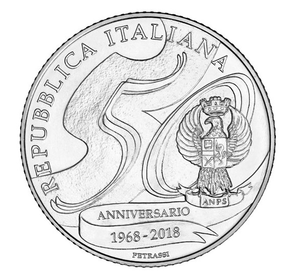硬币是由艺术家Silvia Petrassi设计的,他在正面包括了ANPS的标志,这是与为纪念周年而设计的数字50相结合的。下面是一张题有Anniversario和1968和2018年份的卡片,后面跟着设计师Petrassi的名字。