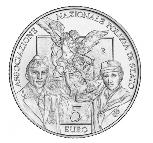 背面的特点,在前景,两个数字代表ANPS在他们的服装制服。背景是详细的艺术作品,从绘画代表圣迈克尔大天使,守护神的警察部队。原来的画是圭多里尼,是保存在圣玛丽教堂的无瑕受孕在罗马。在主设计的右边是字母“R”,标识罗马铸币厂,下面是价值5欧元。周围的设计是纪念铭文协会纳粹Polizia DI Stato。