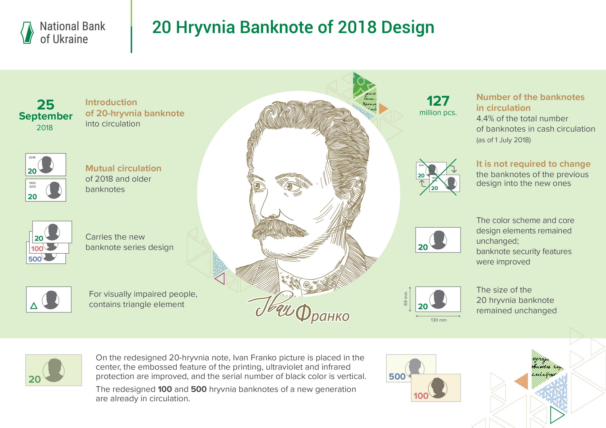 重新设计的20格里夫纳钞票将于2018年9月25日开始流通。