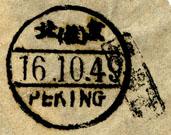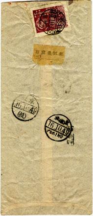 如图1所示,为1949年由华北中国新民主主义青年团中央团校寄北京灯市口育英中学高中部郭霂的挂号封,背面贴面值为200元的纪一庆祝中国人民政治协商会议第一届全体会议纪念邮票一枚,销“38.10.15.华北良乡”地名实线三格日戳(图2),11月16日到达北京,销全中文三格式“北京16.10.49.(投)”(图3)和中英文三格式“北(投)京 16.10.49. PEKING”(图4)投递戳,另盖有投递员姓名章。该封所贴200元面值邮票的发行量仅为35万枚,且单贴用于挂号实寄的非常稀罕。邮票上所销邮戳的年份,仍然使用民国纪年“38”,亦属少见。
