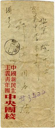 该封尤其引人注目的是,它是预印“中国新民主主义青年团中央团校”文字的制式公函封,而且是由中央团校从河北平山经良乡向北京迁移过程中,且在良乡只有短短几个月的过渡期间寄出的信件,是一枚见证中国新民主主义青年团成长、发展历史的实物。