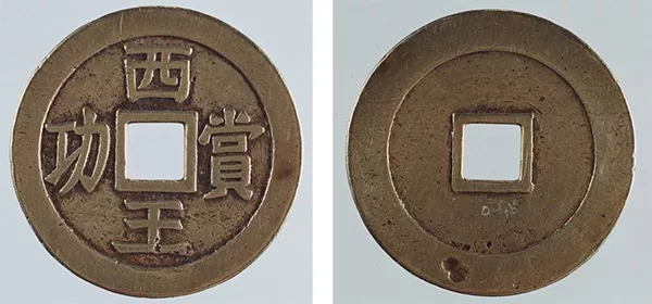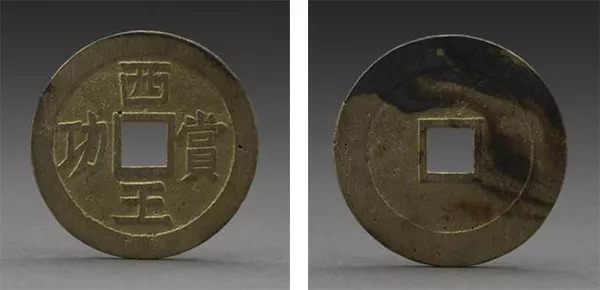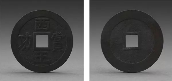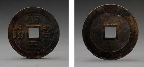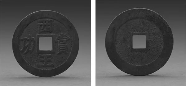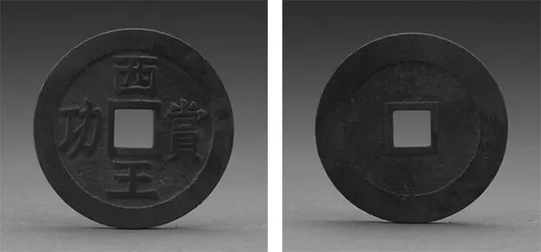 这些金银币的基本特点是:第一,钱体较大,圆形方孔。第二,阔缘,轮郭上密布纵向锉痕,大多与方穿左右两侧平行,个别锉痕略斜。第三,地张较为粗糙。内郭较宽,四角方正。第四,正面方穿四周,铸有“西王赏功”四字楷体阳文,对读。四字分布均匀,笔画较粗,用笔雄强。“西”“王”两字上、下相对,每个字因所处空间呈横势,故两字结体方正;“赏”“功”两字左、右相峙,单字所处空间呈纵向,两字结构均取纵势。第五,素背。内外郭、四字钱文的光洁度均高于地张。第六,铸造工艺水平相差较大,良莠不齐,优质者做工精整,拙劣者沙眼遍布。第七,西王赏功发掘品的大小、重量,存在一定的差异。根据笔者所见到的标本来看,西王赏功金币8枚,一般为金黄色或暗黄色,有的钱体表面局部残存疑似火烧痕迹。钱径5.02—5.05、厚0.16—0.24厘米,重30.37—53.56克。西王赏功银币11枚,因钱体氧化,呈灰黑色。钱径5—5.05、厚0.19—0.22厘米,重33.22—37.84克。