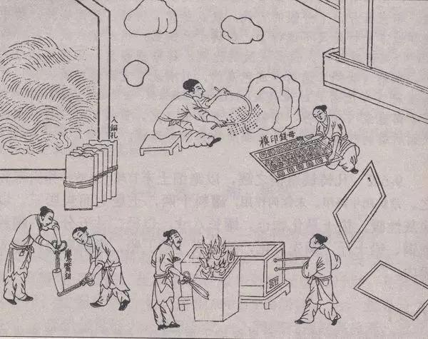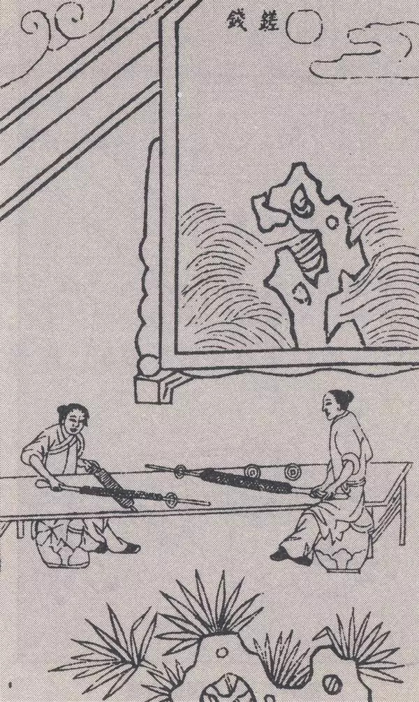 其木框上弦原留入铜眼孔,铸工用鹰嘴钳,洪炉提出熔罐。一人以别钳扶抬罐底相助,逐一倾入孔中。冷定解绳开框,则磊落百文如花果附枝。模中原印空梗,走铜如树枝样,夹出逐一摘断,以待磨锉成钱。凡钱先锉边沿,以竹木条直贯数百文受挫,后锉平面则逐一为之。