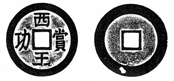 马定祥云:西王赏功“银钱曾见二枚,罗伯昭、申砚丞各藏一枚,珍。银有赝作,须慎之。”根据马氏所云,此类银币已发现过伪品。今见一枚西王赏功银币,阔缘,钱体覆盖一层淡黄色包浆。就其形制而言,正面方穿内郭边缘粗细不均,中细外粗。四字钱文之外的地张之上,平整光洁,无江口遗址考古发掘品地张的粗糙之感。背面外郭下部内侧,有重轮痕迹。正面“西王赏功”四字楷书钱文字形、结构,与江口发掘品钱文特点差别较大,疑点重重,值得深究。
