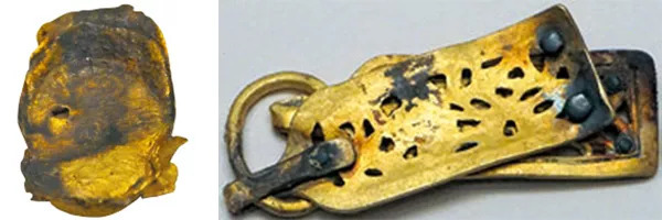 图一九 江口遗址出水金锭(左) 图二〇 江口遗址出水花卉形金扣(右)