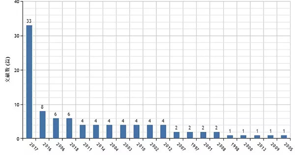 图七 1997-2018年西王赏功币文献发表年度分布图