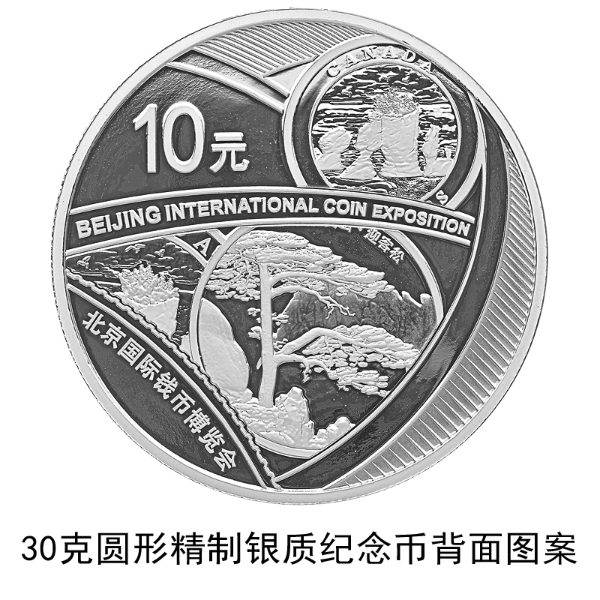 该银质纪念币背面图案为中国的世界遗产黄山金质纪念币与加拿大的好望角岩石银质纪念币图案,结合钱币图形元素组合设计,并刊“北京国际钱币博览会”中英文字样及面额。