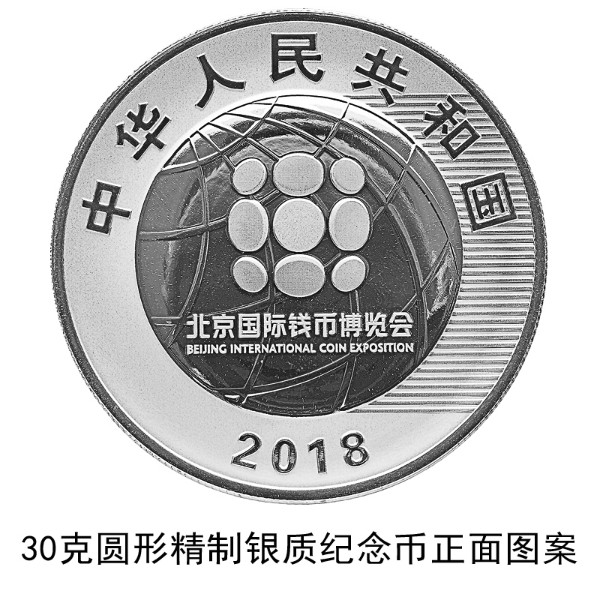 为纪念2018北京国际钱币博览会即将举行,中国人民银行定于2018年10月发行2018北京国际钱币博览会银质纪念币1枚。该币正面主体图案采用北京国际钱币博览会标志,衬以地球图形及象征币齿的线条等组合设计,并刊国名、年号。画面整体设计寓意北京钱币博览会的国际化,体现了国际钱币文化交流的主题。该币背面图案以中国的世界遗产黄山金币与加拿大的好望角岩石银币作为主体元素,结合钱币图形元素组合设计。整体画面构图新颖,结构层次分明,具有现代的艺术美感,充分展现了国际钱币文化交流的设计理念。