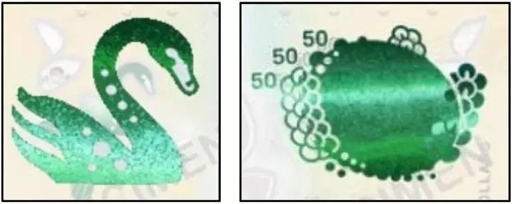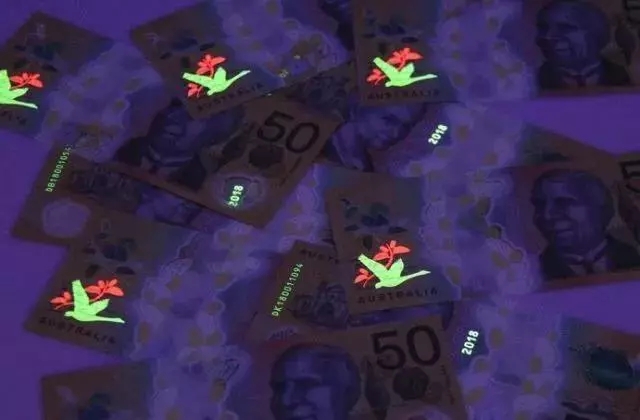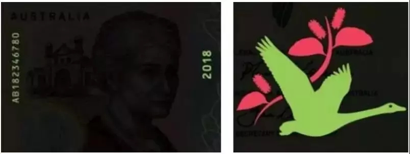在紫光灯下可见钞票连号、黑天鹅及 Wattle(澳洲一种相思属植物)的荧光图像