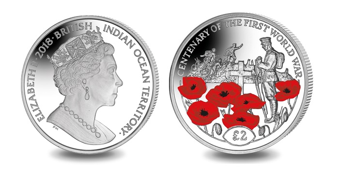 这些纪念币是由波布乔伊铸币厂代表英属印度洋领土的金库在萨里的设施生产的。反设计的特点是一个士兵低着头站在十字架前。从背景中可以看到士兵爬过战壕。罂粟出现在硬币的前景中,以纪念那些牺牲了自己生命的人。