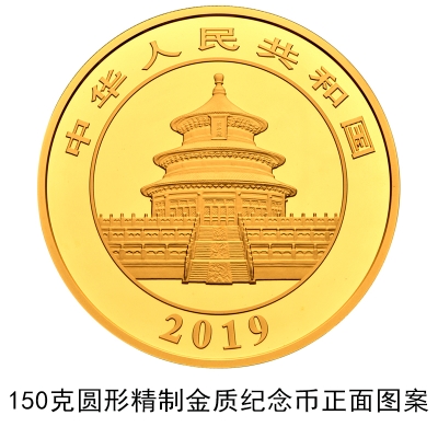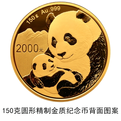 (八)150克圆形金质纪念币为精制币,含纯金150克,直径60毫米,面额2000元,成色99.9%,最大发行量5000枚。