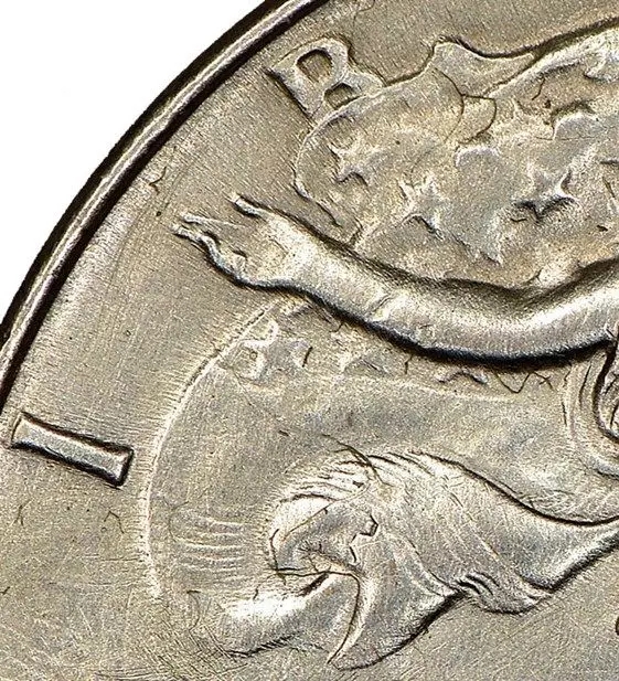 许多收藏家并没有意识到造币厂于1918年对自由女神半美元的图案做了细微的调整。除了加强旗帜和裙子上的线条外,自由女神伸出的手上的拇指也被拉长了。这些轻微的图案变化可以用来判断这枚硬币是铸造于1918年前或1918年后。请注意下方照片中1916年真币样本上较短的拇指和飘扬的旗帜上匮乏的细节。改刻的硬币上显示出与1946年真币样本上同样长的拇指和增强的旗帜细节。