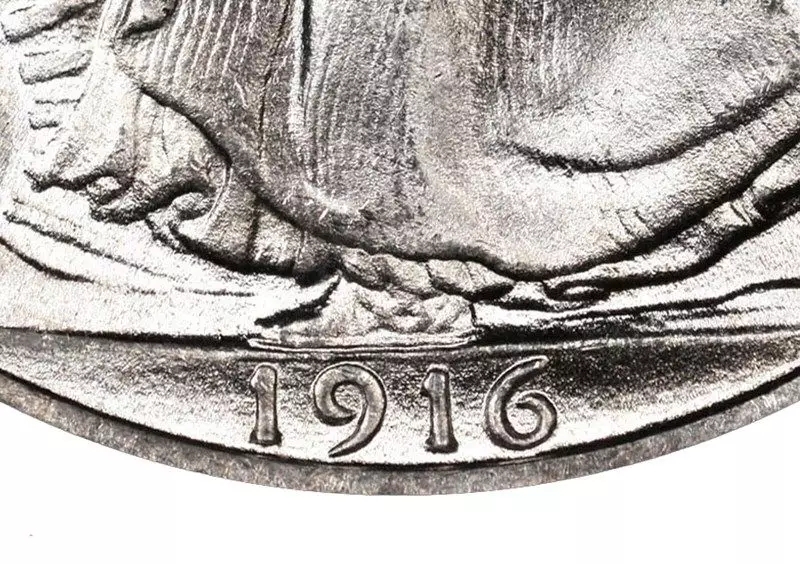 很明显,仅因年号中的“一数之差”,1946年半美元就成了改刻的最佳候选人。最恰当的例子是最近提交到Numismatic Guaranty Corporation(NGC)的一枚年号为1916年的半美元。非常明显这是一枚由造币厂生产的真币,整体细节良好。不过,对于一枚1916年的行走自由女神币来说,细节或许就显得太好了些。