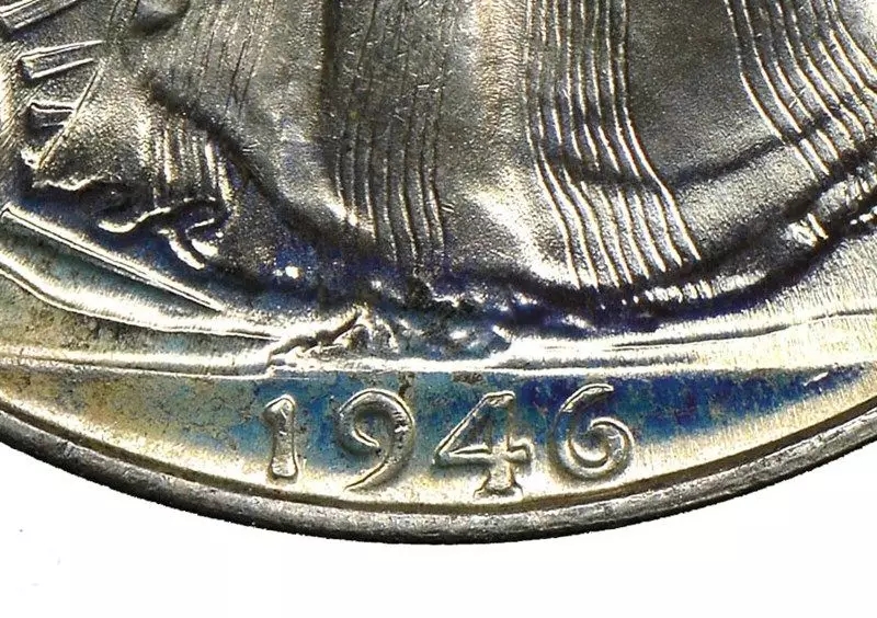 1946年行走自由女神半美元真币上的数字“4”被替换成了“1”,以模仿一枚1916年自由女神半美元。