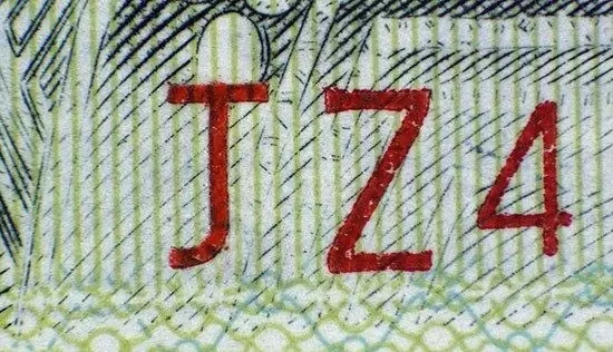 从上图也可以看出这张纸币有过人为改动。很明显字母J是浮在纸上的,而不是纸的一部分。相比之下,字母Z是印入纸中的,序列号本就该如此。