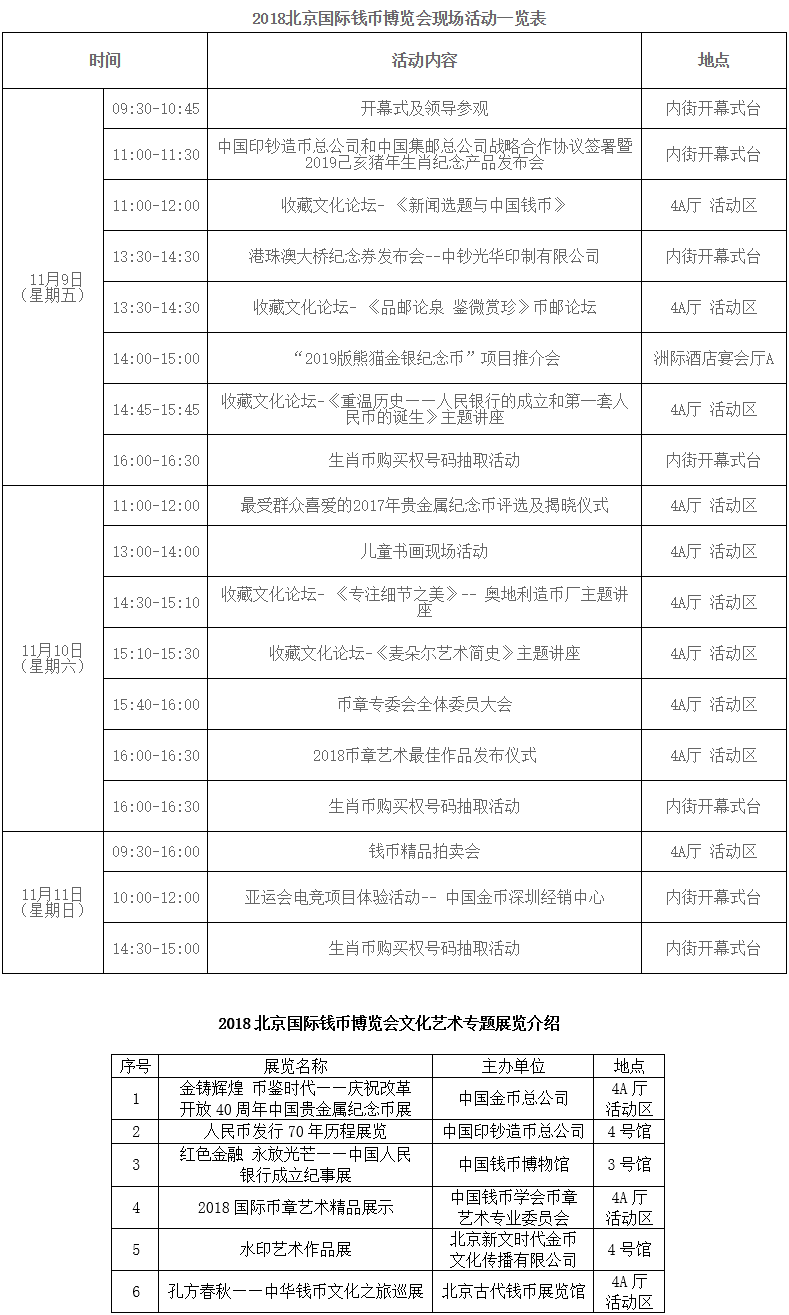 值得一提的是,作为历届博览会的常规活动,参观者持2018北京国际钱币博览会当天门票(票面价格30元)可于博览会举行期间的每天下午闭馆前半小时,参加两次抽取2019中国己亥(猪)年金银纪念币购买权活动。首次抽中的号码不参与第二次抽取。第一次抽中号码的持票者可获得一套2019中国己亥(猪)年彩色金银纪念币的购买权,该套纪念币含3克圆形彩色精制金币1枚和30克圆形彩色精制银币1枚;第二次抽中号码的持票者可获得一套2019中国己亥(猪)年圆形金银纪念币的购买权,该套纪念币含3克圆形精制金币1枚和30克圆形精制银币1枚。凡持有2018北京国际钱币博览会门票号码尾数与当天所抽取号码相同的观众,可凭该门票于规定时间内到指定地点购买2019中国己亥(猪)年金银纪念币相应品种。活动细则和具体购买时间、地点请参阅展厅内公告或登录中国金币网(www.chngc.net)查询。