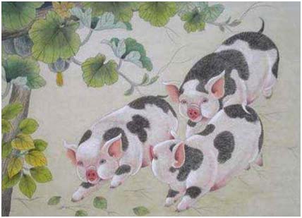 猪是十二生肖之末,是十二地支末位的亥。猪古时称豕。猪是人类最早驯化的动物之一,与马、牛、羊、鸡、犬并称“六畜”,为六畜之首。猪自古与人类关系密切,从原始父系氏族社会到近代,猪一直是人们夸耀财富的标志。汉字“家”古时的写法是人字形的屋顶下一个“豕”字,即屋里有豕方可为家。“家”的字形说明了人与猪的关系和生活状态。猪的形象给人以憨厚老实、安分守己之感。古人曰:“猪入门,百福臻。”千百年来人们总是盼望猪能带来财富和好运。所以,肥猪拱门、猪驮聚宝盆成为年画、剪纸和刺绣等民间艺术世代因袭的画面。