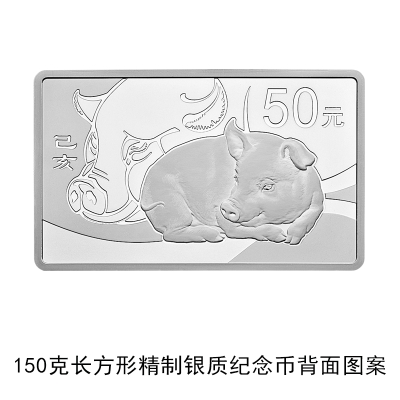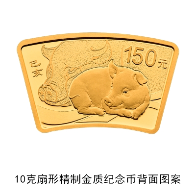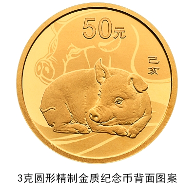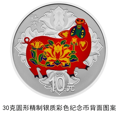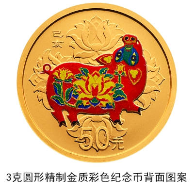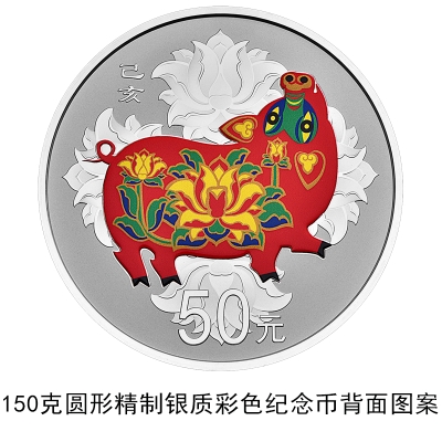 3克圆形金质彩色纪念币、150克圆形金质彩色纪念币、30克圆形银质彩色纪念币、150克圆形银质彩色纪念币等4枚金银纪念币背面图案均为中国民间传统装饰猪造型,衬以吉祥纹饰(局部彩色),并刊面额及“己亥”字样。