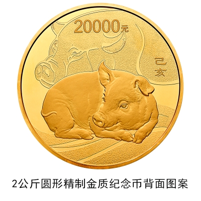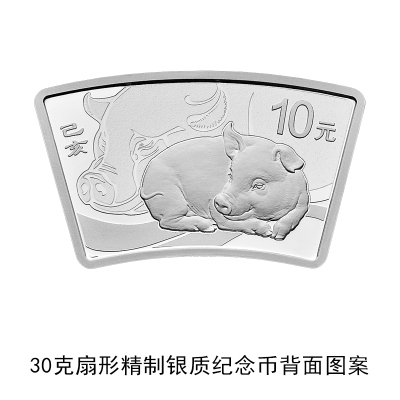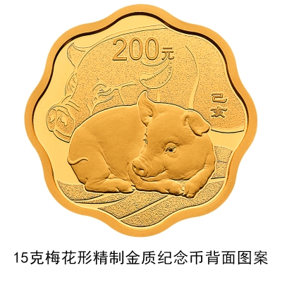 3克圆形金质纪念币、10克扇形金质纪念币、15克梅花形金质纪念币、150克长方形金质纪念币、500克圆形金质纪念币、1公斤梅花形金质纪念币、2公斤圆形金质纪念币、10公斤圆形金质纪念币、30克圆形银质纪念币、30克梅花形银质纪念币、30克扇形银质纪念币、150克长方形银质纪念币、1公斤圆形银质纪念币等13枚金银纪念币背面图案均为写实家猪造型,衬以装饰猪首纹样,并刊面额及“己亥”字样。