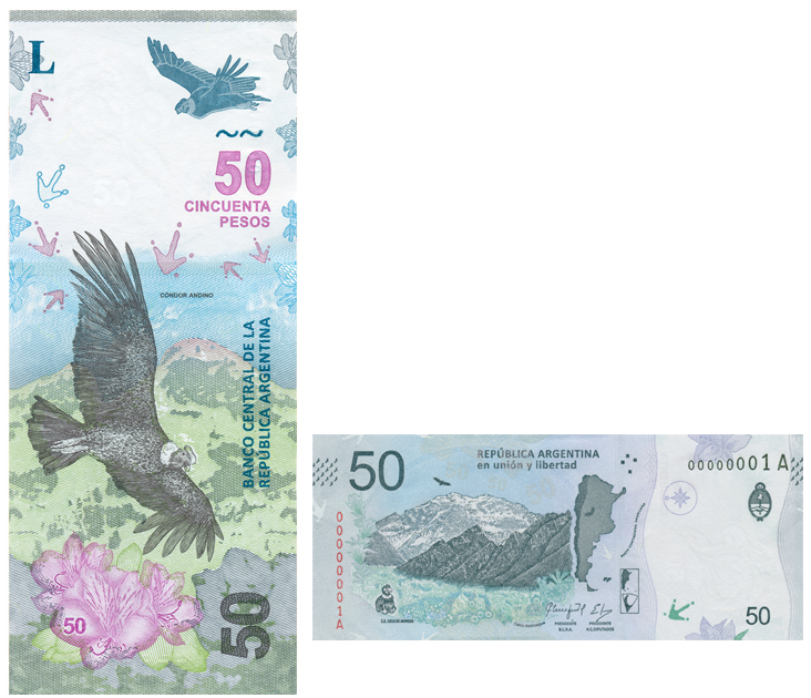 2018年8月15日,2018年阿根廷今天的中央银行(BCRA)投入流通的50比索新币与秃鹰,安第斯山脉的象征鸟和我国周边山区的图像。从8月16日开始,它将逐步通过整个银行分行网络分发。新纸币将与当前流通的相同价值的其他纸币共存。