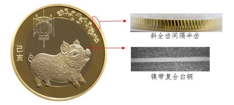硬币外环为黄色铜合金,内芯为具有独特机读性能的镍带复合白铜材料。