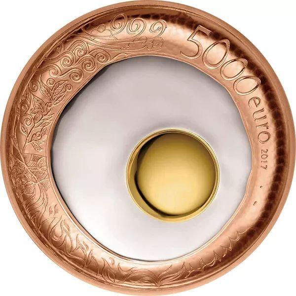 第二名:法国“盖伊·萨瓦餐厅”金币。该币成色为99.9%,重量为1000克,直径为85毫米,面额为5000欧元,最大发行量为11枚。该币最大的特点是使用了玫瑰金、黄金和白金3种材料。硬币正面,由玫瑰金的盘子、黄金的蛋黄、白金的蛋清构成了盘中的煎鸡蛋。背面图案为由鸡、鱼、胡萝卜、草莓、橘子等众多食材组成的手掌。