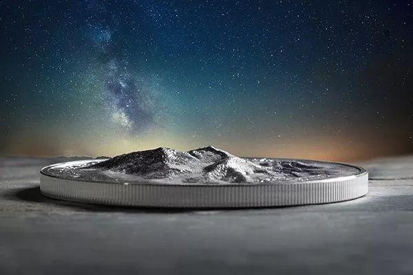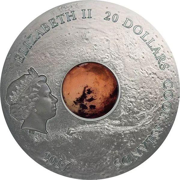 第二名:库克群岛“火星”银币。该币成色为99.9%,重量为3盎司,直径为65毫米,面额为20元,最大发行量为333枚。硬币中间镶嵌的玻璃中,有火星的全彩色图像。背面图案为以浮雕形式展现的火星表面图像,并在底部镶嵌有陨石。火星是太阳的第四颗行星,也是太阳系中第二小的行星,仅次于水星。因为其表面普遍存在的氧化铁使其呈现红色外观,通常被称为“红色星球”。