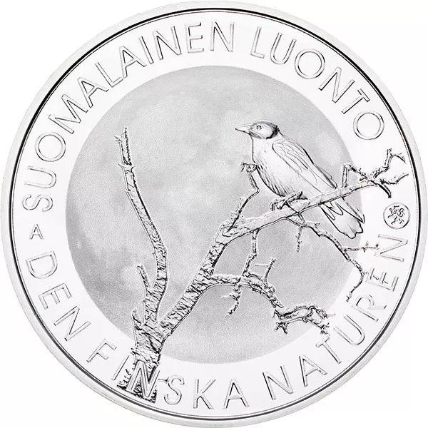 第一名:芬兰“芬兰大自然”银币。该币成色为92.5%,重量为25.5克,直径为38.6毫米,面额为20欧元,最大发行量为5000枚。背面图案为一只在树枝上栖息的乌鸦,背景是哈尔马亚灯塔岛上的满月。