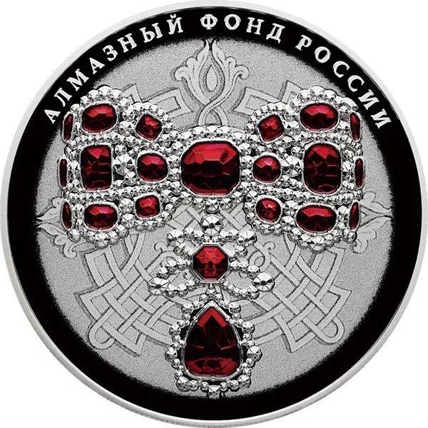 第三名:俄罗斯“奴隶项圈”特别版银币。该币成色为92.5%,重量为169克,直径为60毫米,面额为25卢布,最大发行量为150枚。背面图案为奴隶项圈,并配有彩色图案,背景是俄罗斯传统图案,边缘刻有“俄罗斯钻石基金”的文字。奴隶项圈是俄罗斯钻石基金展出的独特珠宝物品之一,制作于1764年,由贵金属和宝石组成,具有重要的历史和艺术价值。这类珠宝常佩戴在宽大的蕾丝带或紧紧系在脖子上的黑色天鹅绒丝带上。它类似于奴隶项圈,故命名为“奴隶项圈”。
