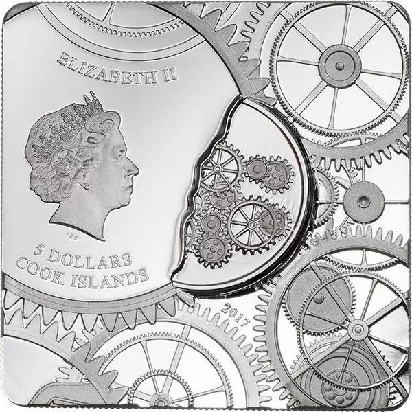 第二名:库克群岛“时间胶囊”银币。该币成色为99.9%,重量为1盎司,边长为35毫米,面额为5元,最大发行量为1500枚。正面图案为多个精致的钟表发条及伊丽莎白二世女王肖像。背面图案为各式现代和古董手表美丽精致的钟面,中间的钟面采用高浮雕技术。时间胶囊是物品或信息的历史记忆,为后代见证当代的某些特殊时刻。通常时间胶囊中密封了令人难忘的物品,并在一段时间内远离公众视野而存放。将时间胶囊作为礼物赠送给亲密朋友或家人正变得越来越流行。该币使用时钟阐释了复杂的时间概念,并且硬币盒作为时间胶囊封存硬币,充分表现了时间胶囊的概念。