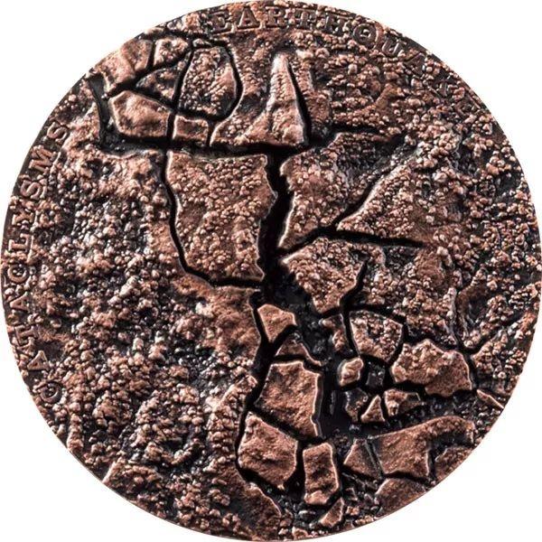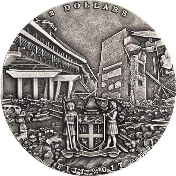 第三名:斐济“地震灾难”银币。该币材质为银镀铜,成色为99.9%,重量为31.1克,直径为38.61毫米,面额为2元,最大发行量为500枚。正面图案为地震灾难发生后的城市景象。背面图案为地震灾难发生后的地球表面。该币向人们展示了地震灾难的影响,提醒我们永远无法征服大自然的力量。