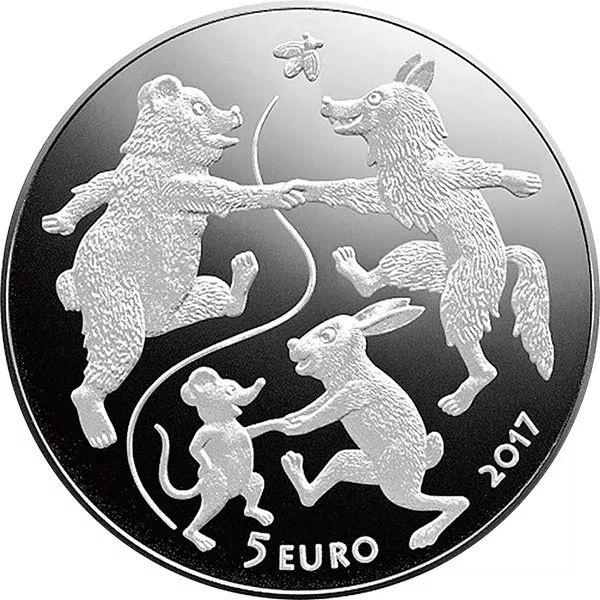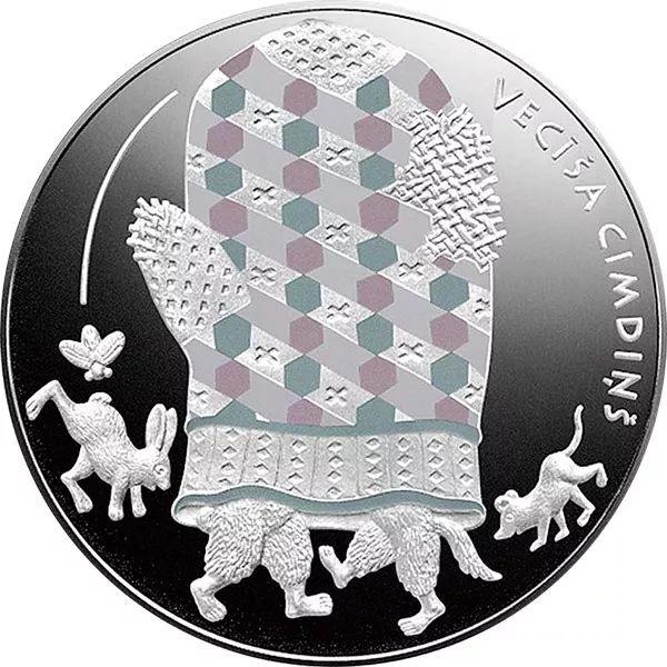 第三名:拉脱维亚“老人的手套”银币。该币成色为92.5%,重量为31.47克,直径为38.61毫米,面额为5欧元,最大发行量为10000枚。正面图案为一个带有图案的手套套住了熊和狼,手套的左侧为昆虫和野兔,右侧为老鼠。背面图案为熊和狼、老鼠和兔子手拉着手,快乐地跳着舞,昆虫在它们之间飞舞。《老人的手套》是拉脱维亚民间故事:从前,一位老人在寒冷的冬日去森林砍柴时,丢失了一个连指手套。老人的手套成了昆虫、老鼠、野兔、狼和熊舒适的庇护所。老人的手套也成了智慧和睿智的象征。