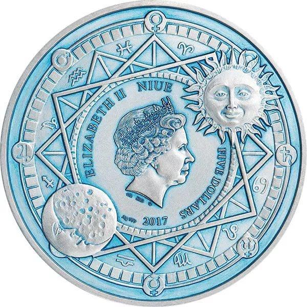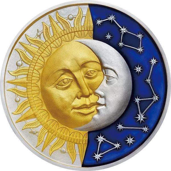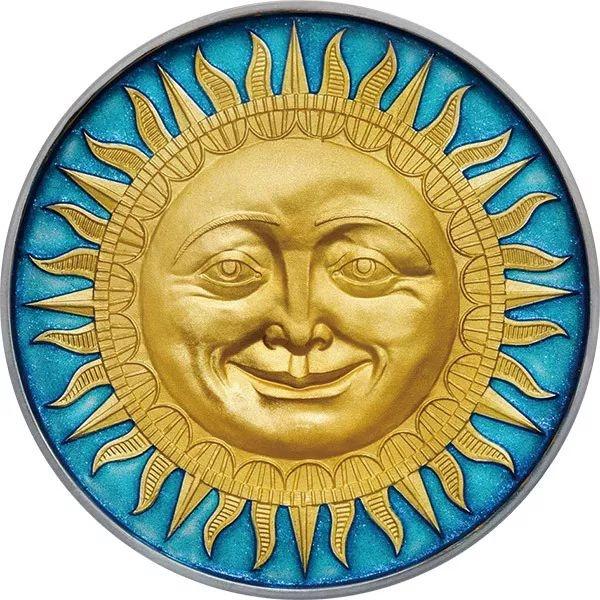 纽埃“太阳”银币。该币成色为99.9%,重量为62.2克,直径为50毫米,面额为5元,最大发行量为500枚。正面中间为伊丽莎白二世女王肖像,周围为十二角星、星座、行星符号、太阳、月亮等图案。背面图案为一个美丽笑脸的镀金太阳,周围是代表天空的蓝色金属珐琅。