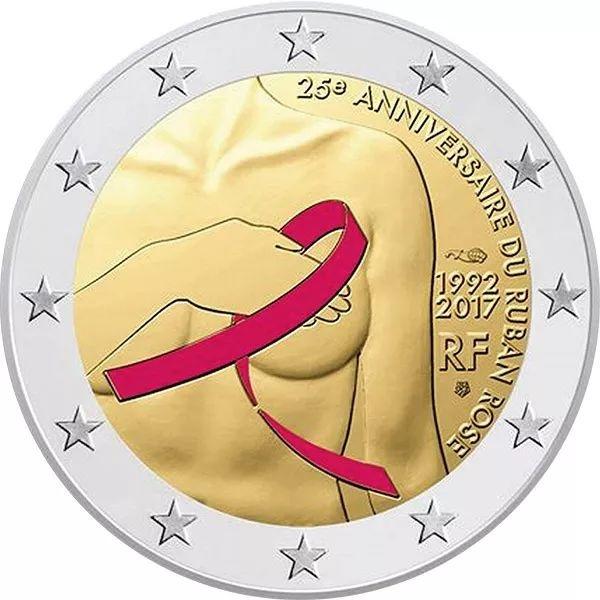 第二名:法国“环游巴黎”银币和“粉红丝带25周年”双金属币。“环游巴黎”银币成色为33.3%,重量为17克,直径为31毫米,面额为10欧元,最大发行量为170000枚。正面图案为法国时装设计师让-保罗·高缇耶眼中的巴黎景象。“粉红丝带25周年”双金属币重量为8.5克,直径为25.75毫米,面额为2欧元,最大发行量为10000枚。正面图案为一位女性手拿粉红丝带护住自己的胸部。