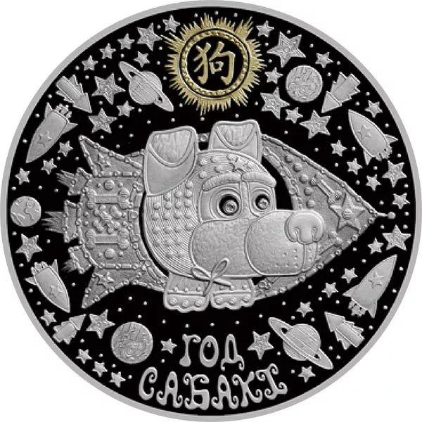 第三名:白俄罗斯“狗年”银币。该币成色为92.5%,重量为33.63克,直径为38.61毫米,面额为20白俄罗斯卢布,最大发行量为1000枚。正面图案为由发条、太阳和月亮等元素构成的圆形图案,发条中心嵌入了立方氧化锆。背面图案为一只卡通狗坐在火箭里,周围被星球和火箭包围。