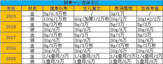 直接看吉祥文化历年发行情况吧。少了两枚金币,剩下的两枚金币,直接剩下1/6和1/3。银币减量的节奏也是欢天喜地。