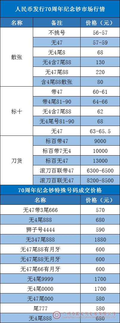 在二批兑换前,不少藏友猜测随着兑换的进行,70周年纪念钞市场存量增加,行情会随之下跌。但没想到,二批出来后,70周年纪念钞的市场行情反而是稳中带升!目前,散张在56-57元左右,标十基本在60元以上,好号价格更是坚挺,部分纪念钞成交如下表所示:
