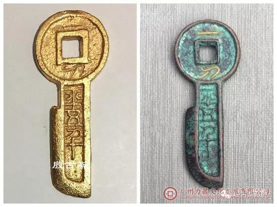 中国历代金属货币的材质多采用铜,因铜具有熔点低易加工、耐腐蚀的优越性,且矿藏丰富。最早出现的金属货币是商朝的铜贝,商晚期西周早期出现的包金铜贝,算是最早的贵金属货币吧。商周时期是中国历史上有名的青铜时代,那时青铜冶炼铸造技术发达,制作的青铜器非常精美,非后世者所得望其肩项。从三星堆和金沙遗址出土的各种金箔制器来看,商周已经开始使用黄金制造器物。从薄薄的一层金箔可以看出黄金特有的“贵重、珍稀”的天然属性,也侧面说明当时黄金产量不大。