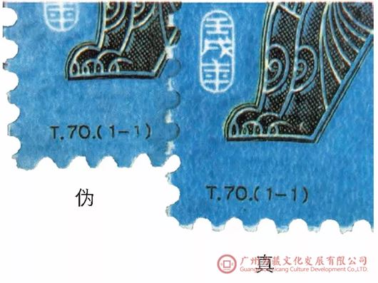 真品《丙戌年》版票上的异形齿孔采用磨合法,齿孔边缘常留有未完全脱落的纸屑;伪品则采用冲压法,齿孔周围光滑,无纸屑。