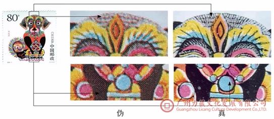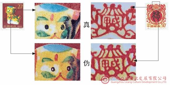 真品《甲戌年》邮票采用影雕套印。影写版印制的图文,各种刷色的网纹夹角均呈45°,圆点大小相同,呈中空状,文字笔画边缘呈锯齿状,雕刻版印制的图案,线条清晰,凸出纸面;伪品采用胶印,各种刷色网纹夹角各不相同,网点呈实心状,经测定,伪甲和伪乙均采用胶版175-200线/英寸套色印制,各种刷色网纹夹角伪红色呈15°,蓝色呈75°,黑色45°,黄色呈0°,而伪乙红色呈75°,蓝色呈15°,黑色呈45°, 黄色呈0°。两种伪品(2-2)中的图案中心篆书“狗”字,均采用黑色网纹版专版套印,这与真品采用雕刻版印制,区别极明显。