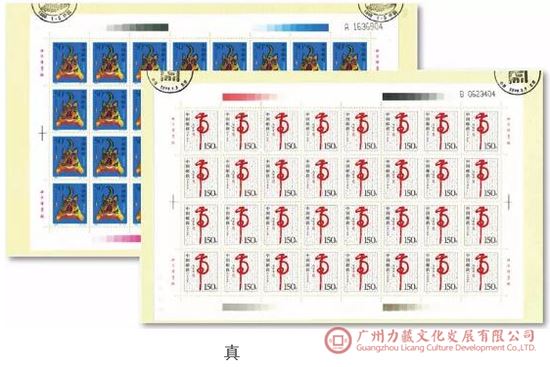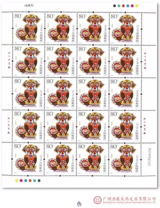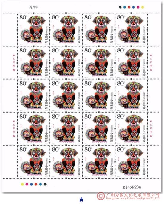 对于《丙戌年》邮局全张邮票的鉴定,在进行上述版别鉴定的基础上,还应该注意邮局全张边纸上的黑色数字喷码特征,真品和伪品所用黑色数字喷码字体有别。在鉴定中还发现,真品与伪品黑色数字喷码喷印在版票纸面上的位置也不一样,真品喷印在版票下边纸右下角,伪品则喷印在版票的右边纸右下角上。