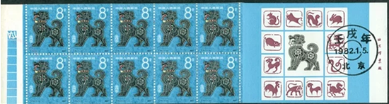 1982年1月5日,中国邮政发行了T.70《壬戌年》特种邮票,全套一枚,邮票面值8分,票幅规格为26毫米×31毫米,发行量1411.16万枚。邮票图案以宝蓝色衬底,描绘了一只颈戴项圈、昂首挺胸、伸着长长的舌头、竖尾轻摇的家狗形象,显得十分健美。周令钊设计,高品璋雕刻,影雕套印,齿孔11.5度,背面刷胶,邮局全张枚数80(8×10),北京邮票厂印制。