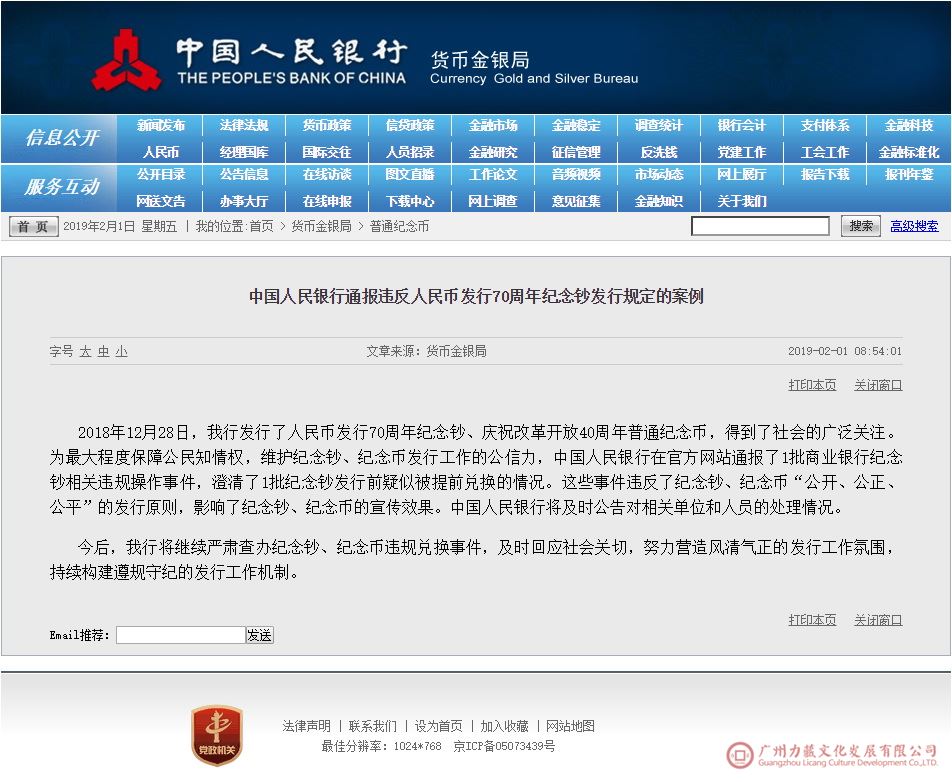 央行公告表示,2018年12月28日,我行发行了人民币发行70周年纪念钞、庆祝改革开放40周年普通纪念币,得到了社会的广泛关注。为最大程度保障公民知情权,维护纪念钞、纪念币发行工作的公信力,中国人民银行在官方网站通报了1批商业银行纪念钞相关违规操作事件,澄清了1批纪念钞发行前疑似被提前兑换的情况。这些事件违反了纪念钞、纪念币“公开、公正、公平”的发行原则,影响了纪念钞、纪念币的宣传效果。中国人民银行将及时公告对相关单位和人员的处理情况。