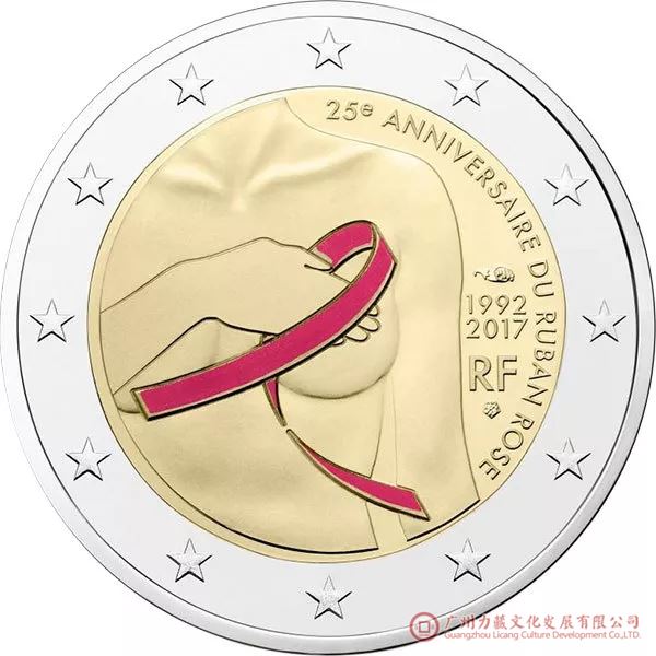 粉红丝带运动发起以来,得到全球女性的积极响应,与乳腺癌斗争成为全球健康事业的重点工作。2017年是粉红丝带运动发起25周年,法国为此发行了一枚2欧元双金属纪念币。该币为铜合金材质的双金属币,重量为8.5克,直径为25.75毫米,发行量为10000枚。硬币正面为2欧元硬币的标准图案,背面图案描绘了一条粉红丝带,被女性用来守护自己的胸部。
