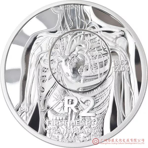 为庆祝世界首例心脏移植手术成功50周年,南非发行了一套设计精巧的纪念币,此次获奖的是其中的2兰特银币。该枚银币成色为92.5%,重量为33.626克,直径为38.725毫米,发行量为1000枚。